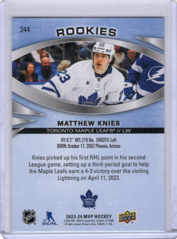 You are purchasing a 2023-24 Upper Deck MVP Matthew Knies #244. You will receive the exact item in the photographs. Thank you for looking.
