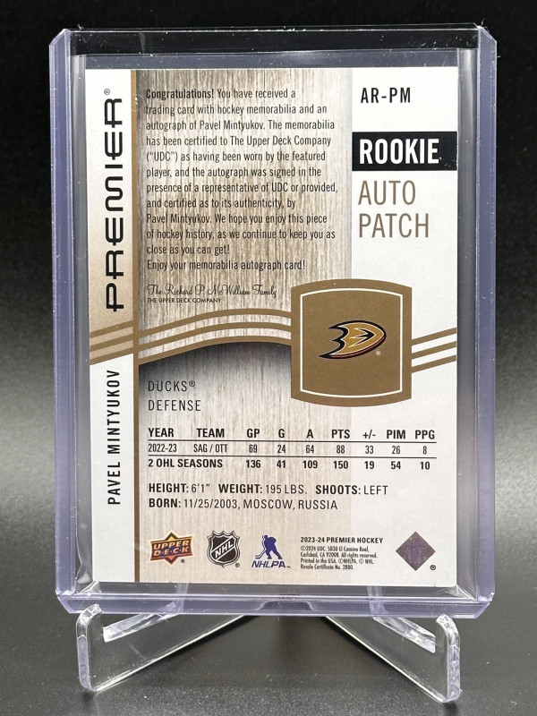 2023-24 Upper Deck Premier Pavel Mintyukov Acetate Gold Rookie Auto Patch (48/65)