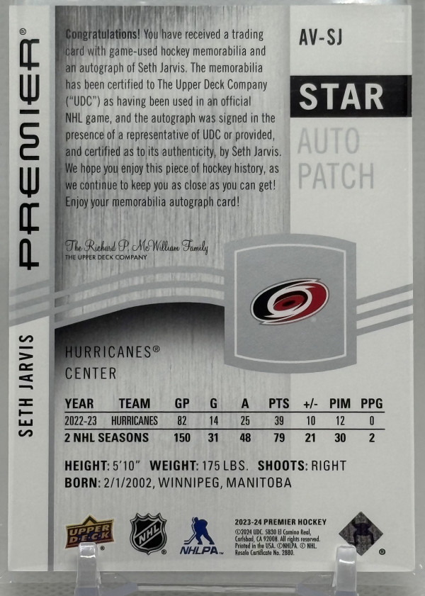 Straight from pack to top loader. Really nice patch and autograph of the Hurricanes' Seth Jarvis.