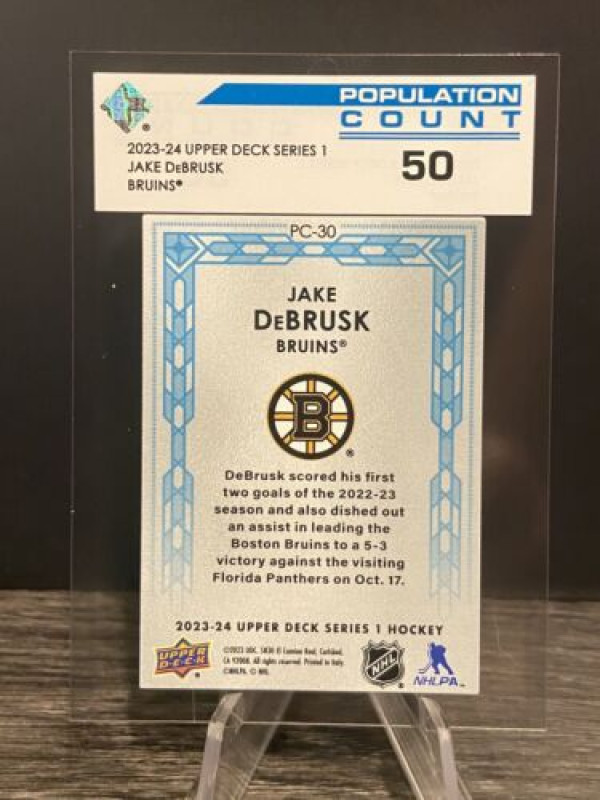 2023-24 Upper Deck Series 1 Population Count 50 Jake DeBrusk #PC-30 Bruins. Condition is Ungraded. Shipped with USPS Ground Advantage. Listed with Mascot.