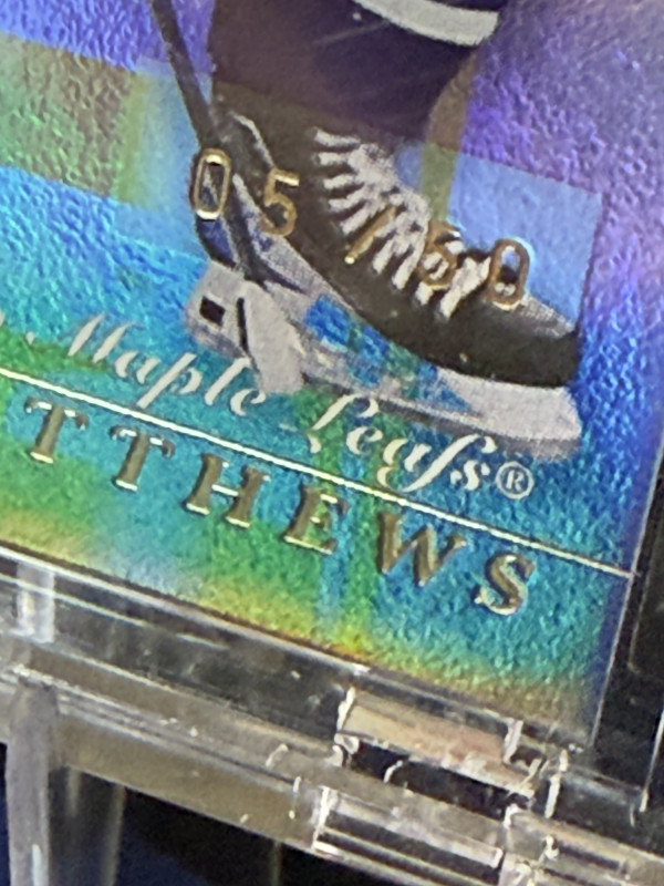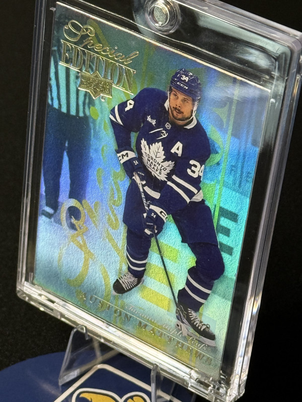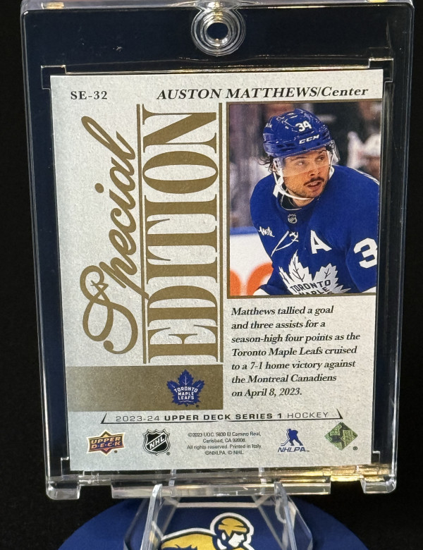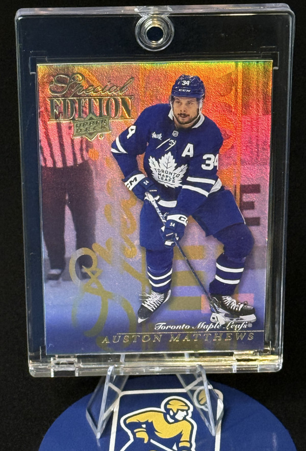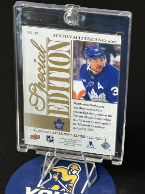 Here is a numbered out /50 Speciel addition gold Auston Matthews from Upler Deck 2023-24. The card is in raw condition as pictured.