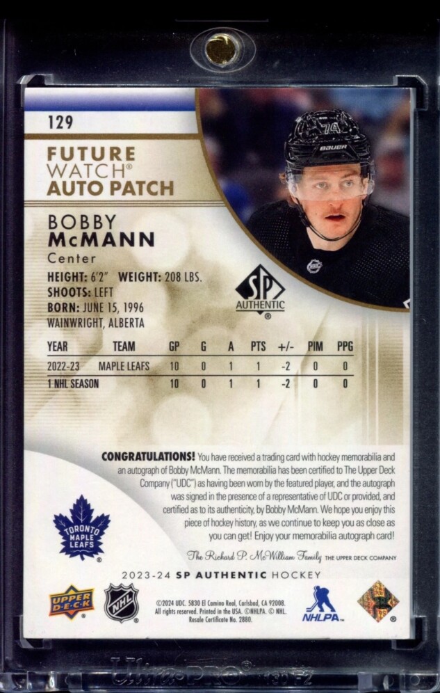 2023 - 24 Upper Deck SP Authentic Bobby Mcmann Future Watch Auto Patch /100 RC