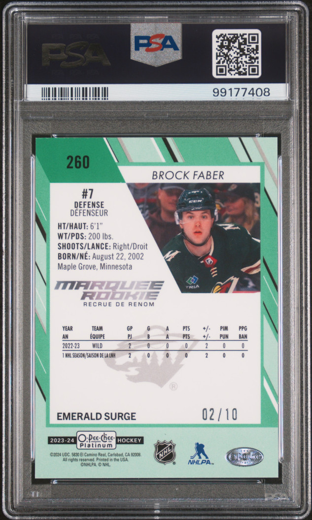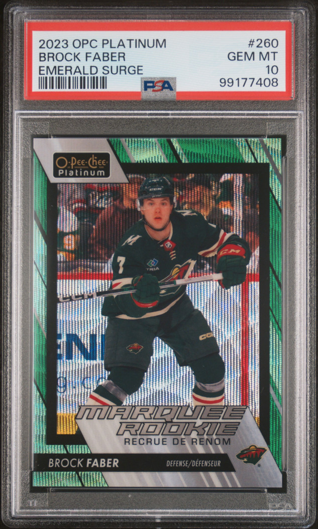 2023 O-Pee-Chee Platinum - Brock Faber Emerald Surge #260 MARQUEE ROOKIE SSP /10 PSA GEM MINT 10