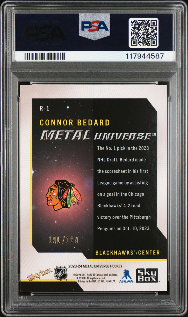 2023 Skybox Metal Universe 2008-09 Rookie Retros Connor Bedard '08-09 Rk Retro-Prp Spct Fx. These don’t see to get a lot of love for some reason! But a cool rookie card of bedards IMO! Super low pop of 3 with only 1 higher!