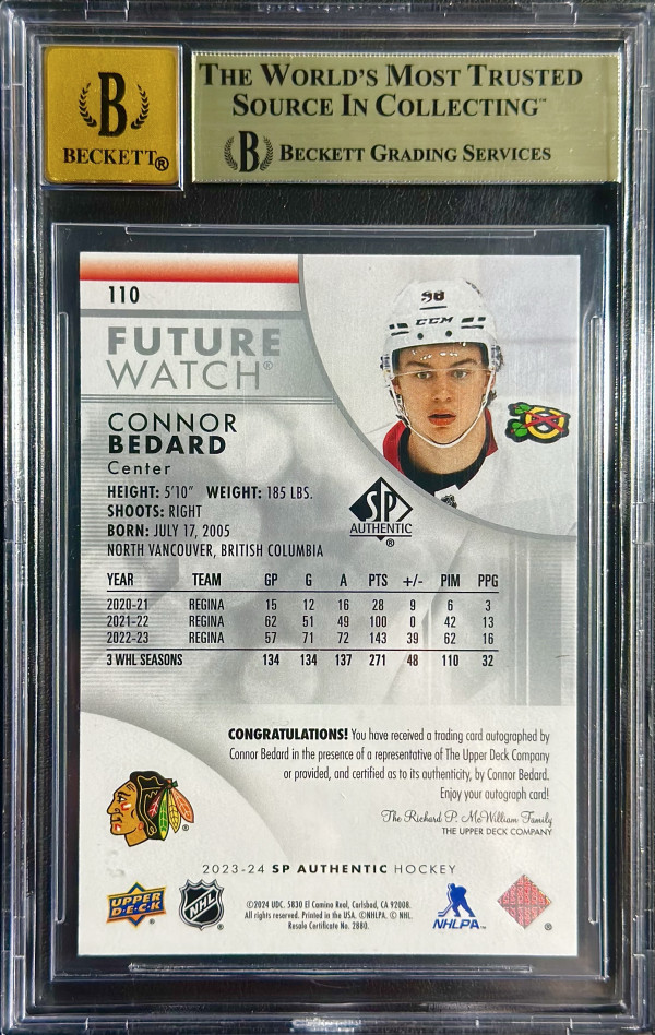 2023 SP Authentic Connor Bedard Future Watch Auto BGS 9.5 Auto 10