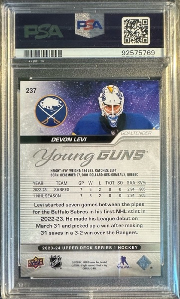 2023 Upper Deck 237 Devon Levi Silver Outburst Young Guns PSA 10 Gem Mint