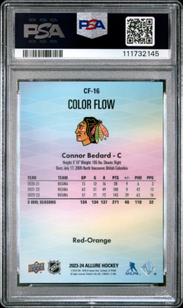 Thanks for your looking at my listing 2023 Upper Deck Allure Color Flow Connor Bedard Color Flow-Red-Orange PSA 9. Let me know if you have any questions!