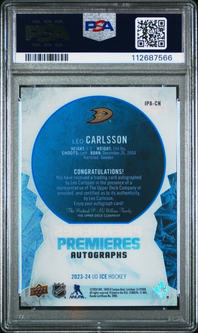 Thanks for your looking at my listing 2023 Upper Deck Ice Ice Premieres Autographs Leo Carlsson PSA 8. Let me know if you have any questions!