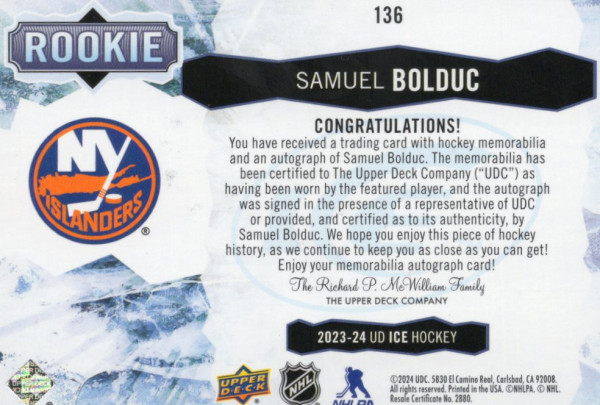 2023 Upper Deck Ice Rookies Gold /99 Samuel Bolduc #136 RPA Rookie Patch Auto RC