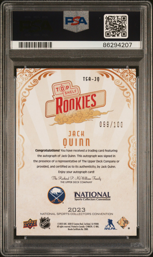 2023 Upper Deck National Sports Collectors Convention Top Shelf Nhl Rookies Autograph Jack Quinn #99/100