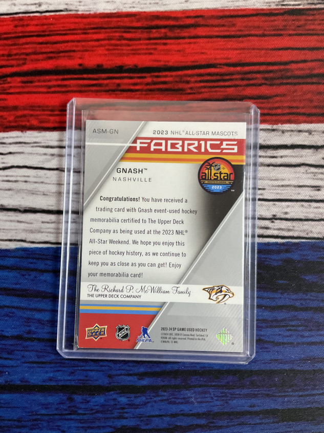 You are purchasing a 2023 Upper Deck NHL All-Star Mascots Fabrics Gnash #ASM-GN Event-worn jersey Relic. You will receive the exact item in the photographs. Thank you for looking.