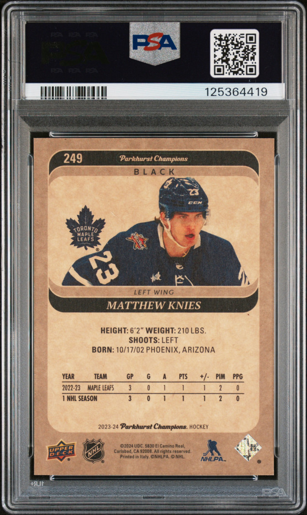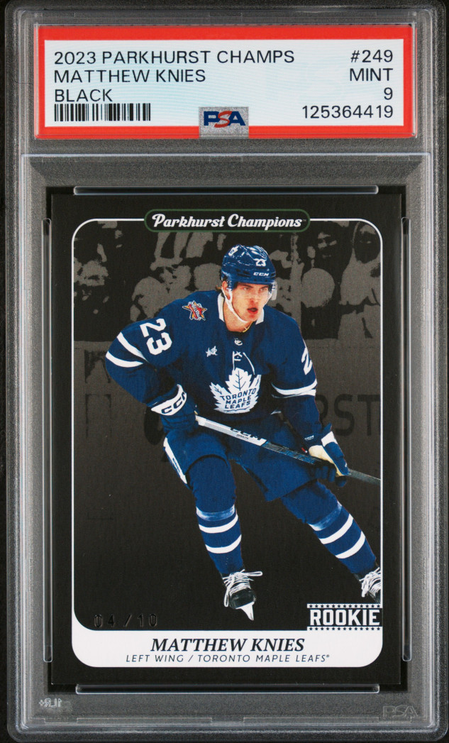 2023 Upper Deck Parkhurst Champions Matthew Knies Rookie Black PSA POP COUNT 1