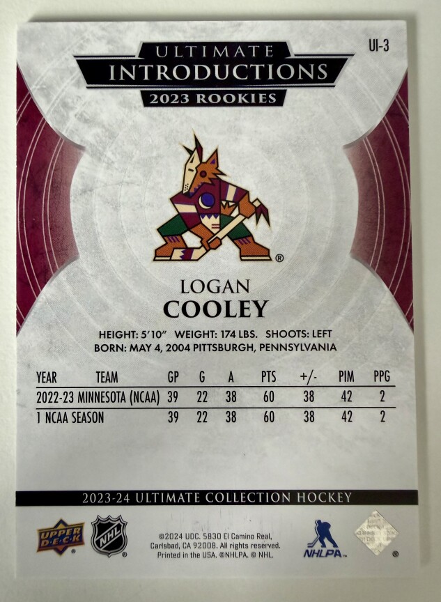 You are purchasing a 2023 Upper Deck Ultimate Collection Ultimate Introductions Logan Cooley Rookie. You will receive the exact item in the photographs. Thank you for looking.