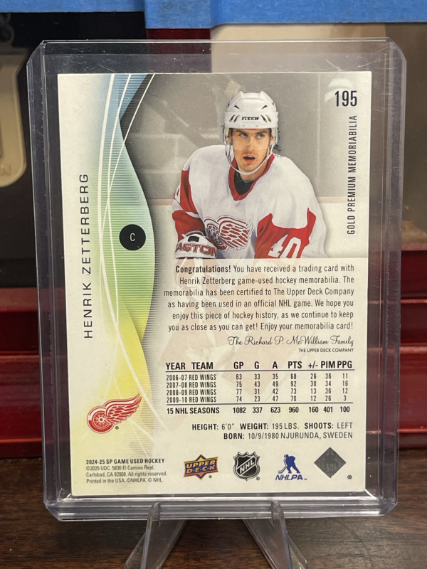 Henrik Zetterberg 2024-2025 SP Game Used Gold Premium Memoriabilia 14/25 Two Color Patch