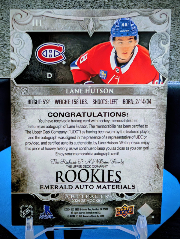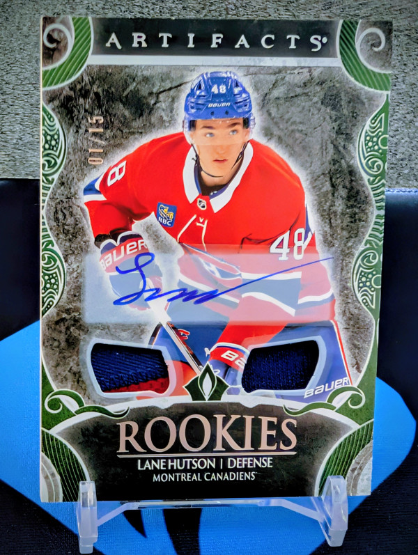You are purchasing a 2024-25 Artifacts Rookie Emerald Auto Materials RPA of Lane Hutson, bookend numbered 1/15.