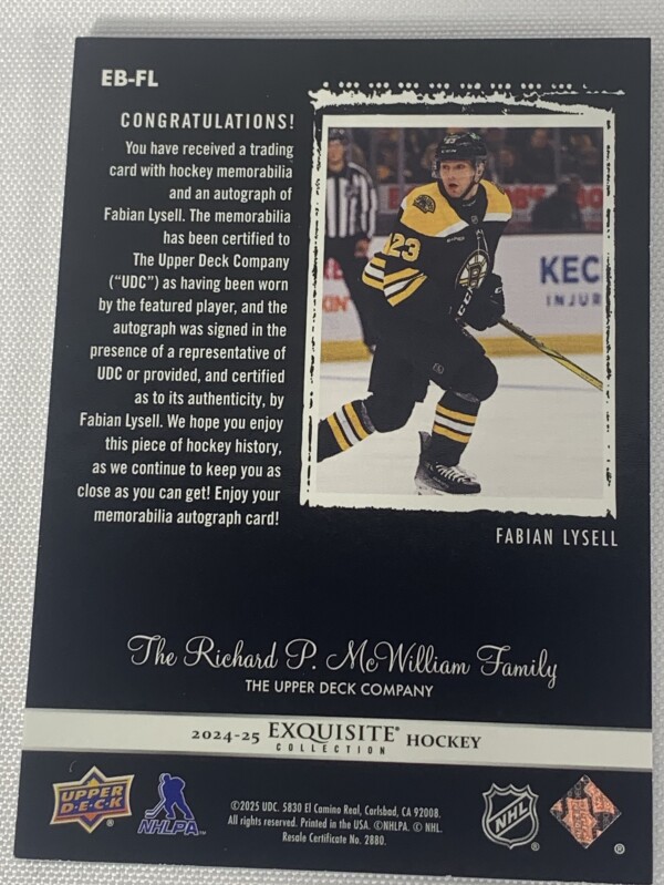 2024-25 Exquisite Hockey Fabian Lysell Exquiste Autograph Rookie Patch /25 Black