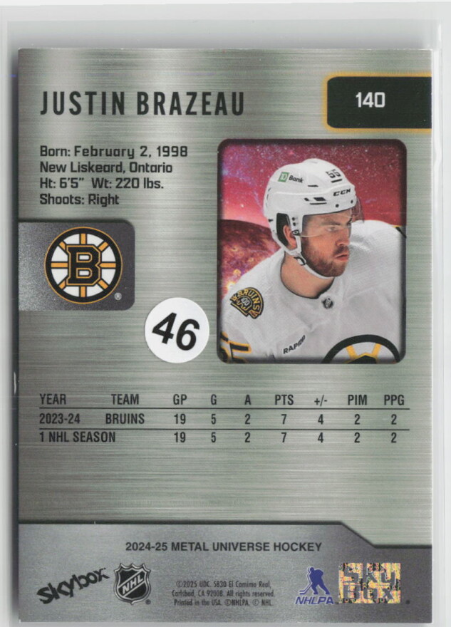 You are purchasing a 2024-25 Metal Universe Hockey Justin Brazeau #140 Rookie. You will receive the exact item in the photographs. Thank you for looking.