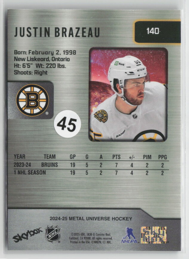 You are purchasing a 2024-25 Metal Universe Hockey Justin Brazeau #140 Rookie. You will receive the exact item in the photographs. Thank you for looking.