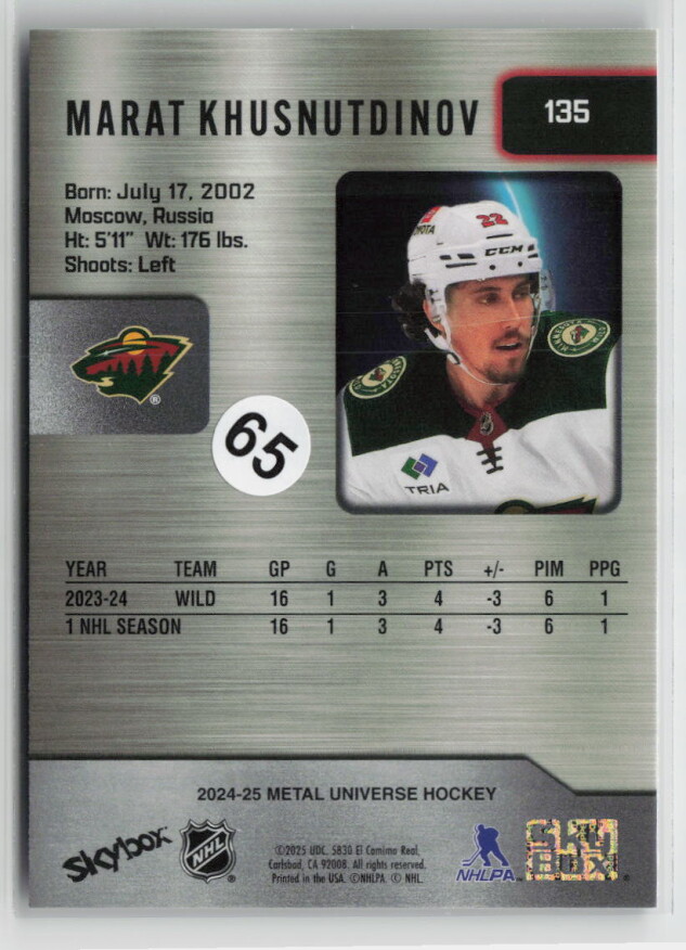 You are purchasing a 2024-25 Metal Universe Hockey Marat Khusnutdinov #135 Rookie. You will receive the exact item in the photographs. Thank you for looking.