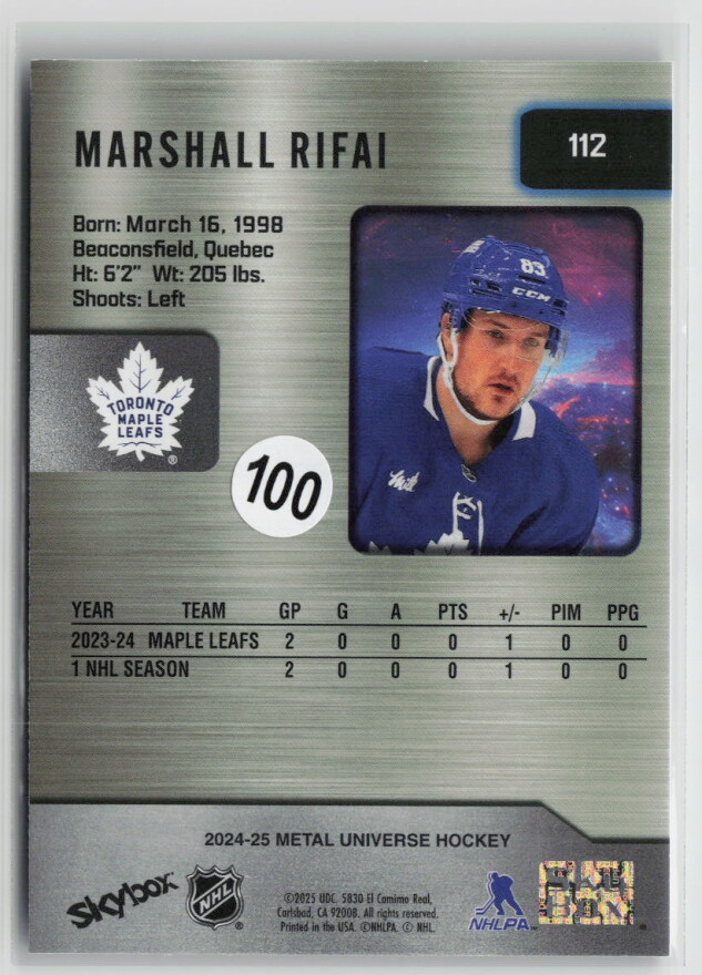 You are purchasing a 2024-25 Metal Universe Hockey Marshall Rifai #112 Rookie. You will receive the exact item in the photographs. Thank you for looking.