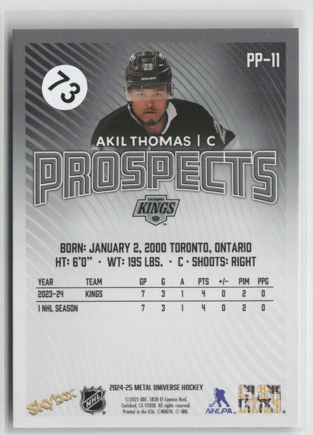 You are purchasing a 2024-25 Metal Universe Hockey Prospects Akil Thomas #PP-11. You will receive the exact item in the photographs. Thank you for looking.