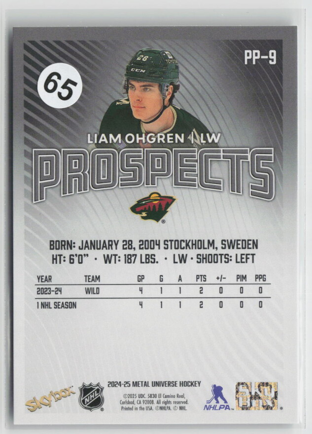 You are purchasing a 2024-25 Metal Universe Hockey Prospects Liam Ohgren #PP-9. You will receive the exact item in the photographs. Thank you for looking.