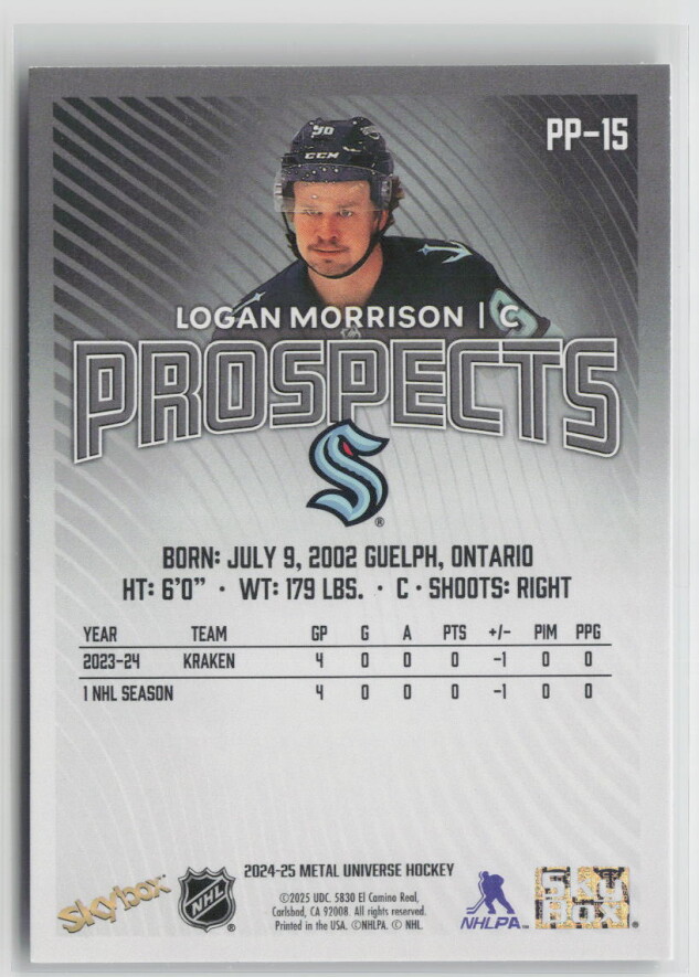 You are purchasing a 2024-25 Metal Universe Hockey Prospects Logan Morrison #PP-15. You will receive the exact item in the photographs. Thank you for looking.