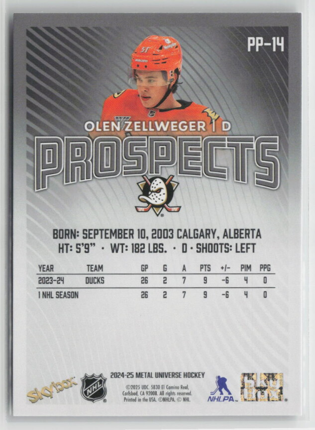 You are purchasing a 2024-25 Metal Universe Hockey Prospects Olen Zellweger #PP-14. You will receive the exact item in the photographs. Thank you for looking.