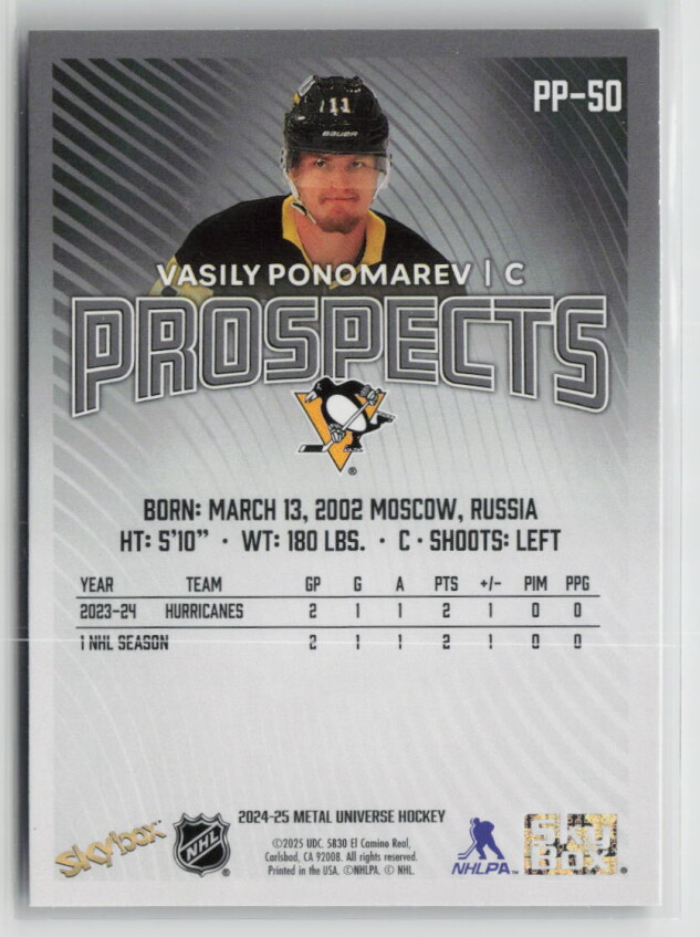 You are purchasing a 2024-25 Metal Universe Hockey Prospects Vasily Ponomarev #PP-50. You will receive the exact item in the photographs. Thank you for looking.