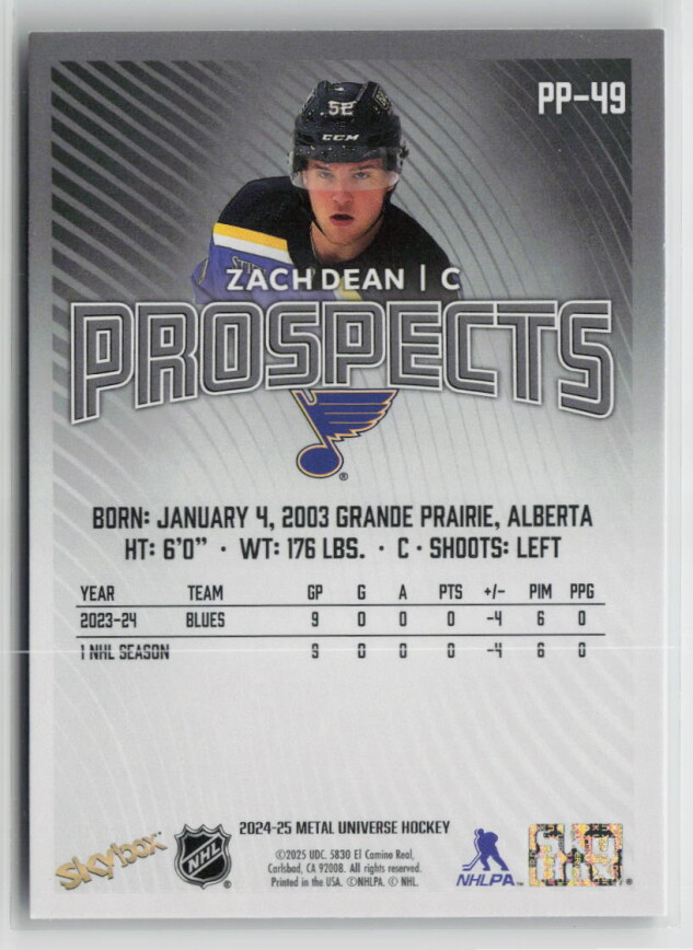You are purchasing a 2024-25 Metal Universe Hockey Prospects Zach Dean #PP-49. You will receive the exact item in the photographs. Thank you for looking.