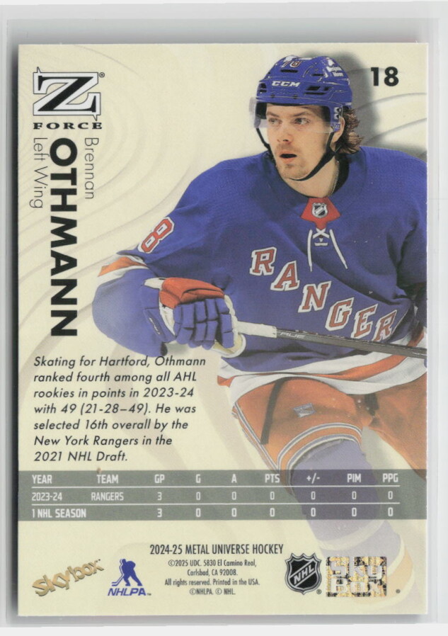 You are purchasing a 2024-25 Metal Universe Hockey ZForce Brennan Othmann #18 Rookie. You will receive the exact item in the photographs. Thank you for looking.