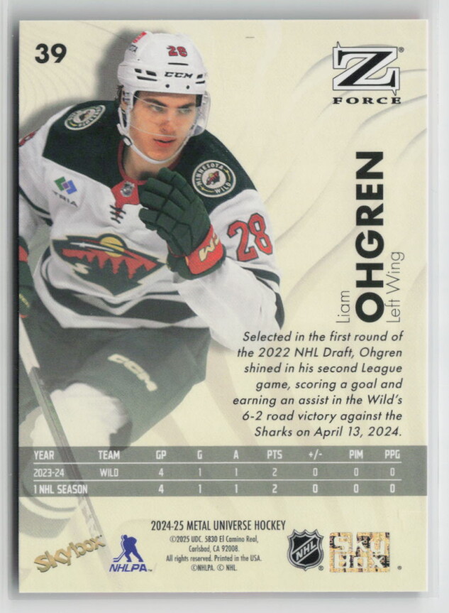 You are purchasing a 2024-25 Metal Universe Hockey ZForce Liam Ohgren #39 Rookie. You will receive the exact item in the photographs. Thank you for looking.