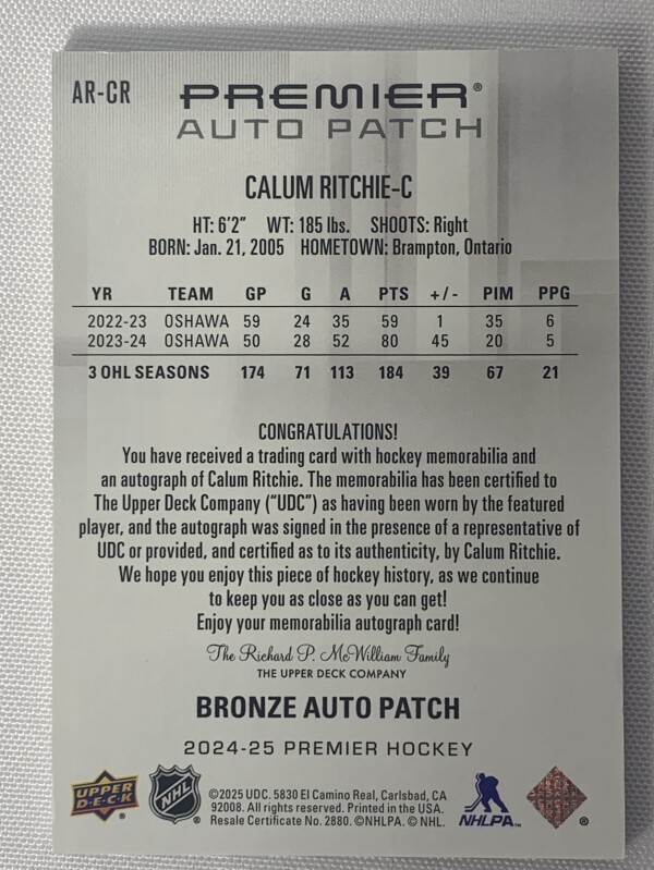 2024-25 Premier Hockey Calum Ritchie Rookie Patch Auto /249