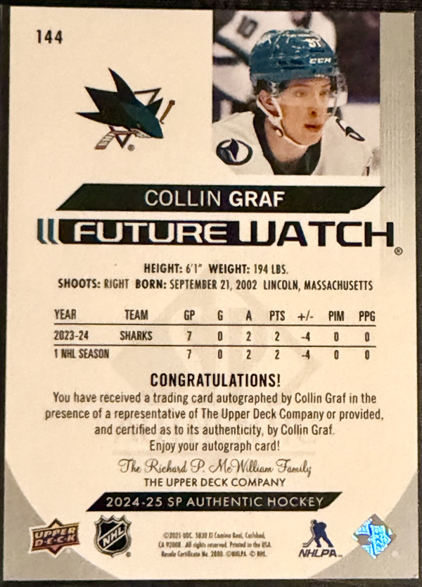2024-25 SP Authentic Hockey Future Watch Auto Colin Graf /999