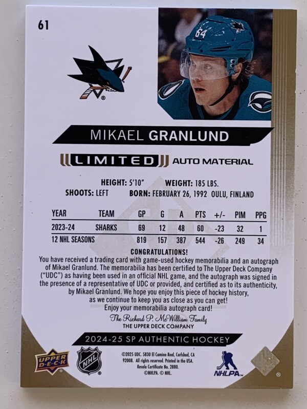 2024-25 SP Authentic Mikael Granlund Limited Auto Material /100