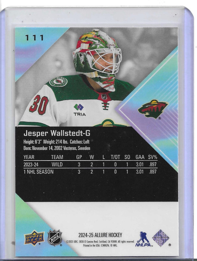 The 2024-25 Upper Deck Allure Jesper Wallstedt #111 Rookies trading card is an original English-language sports trading card featuring the rookie player Jesper Wallstedt from the Minnesota Wild in the National Hockey League (NHL). Manufactured by Upper Deck, this standard-sized card is made of card stock and is part of the base set for the 2024-25 season. With no autograph included, this collectible item is perfect for fans of ice hockey and sports trading cards looking to add a piece of the excitement of the NHL to their collection.