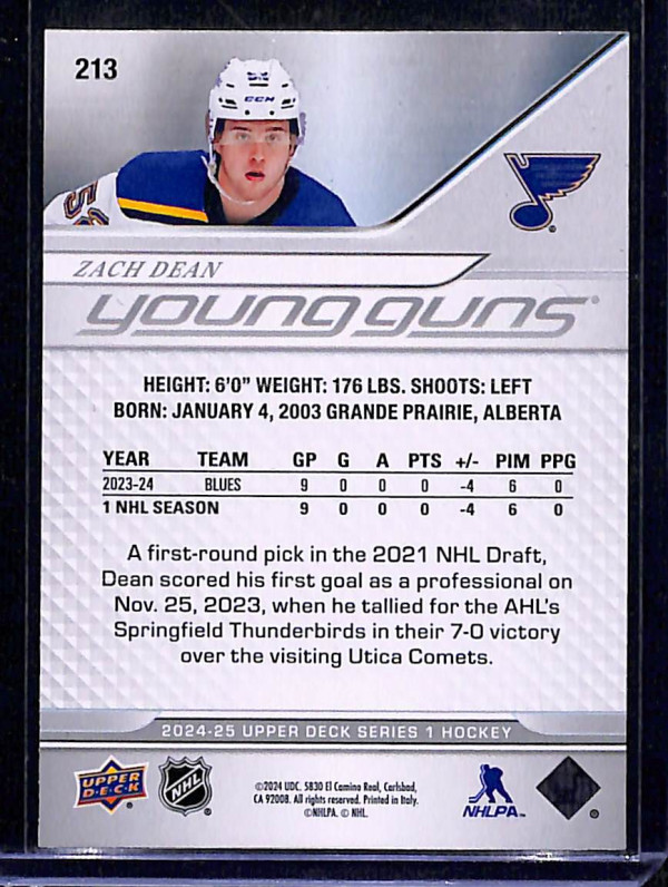 You are purchasing a 2024-25 Upper Deck Series 1 Zach Dean #213. You will receive the exact card in the photographs. Thank you for looking.