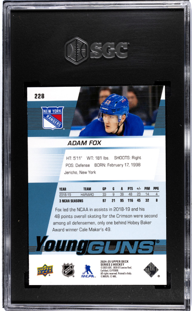 You are purchasing a 2024 Upper Deck Adam Fox #228 Young Guns Renewed SGC 9. You will receive the exact item in the photographs. Thank you for looking.