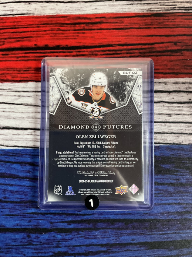 Don't miss your chance to own this rare 2024 Upper Deck Black Diamond Diamond Futures card featuring Anaheim Ducks standout Olen Zellweger! This NHL collectible is autographed and showcases the premium quality and design collectors expect from Upper Deck, making it a must-have addition for any hockey fan or card enthusiast.