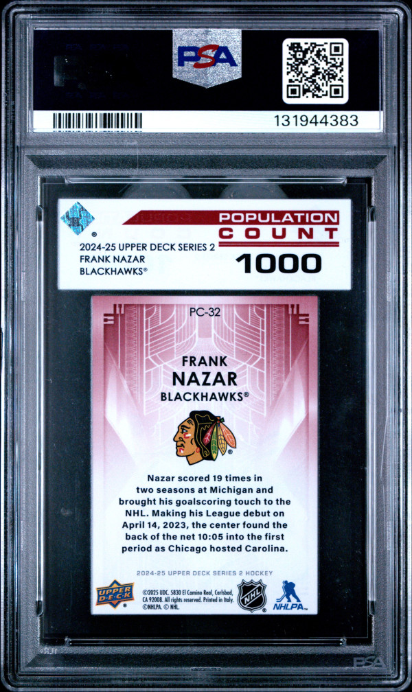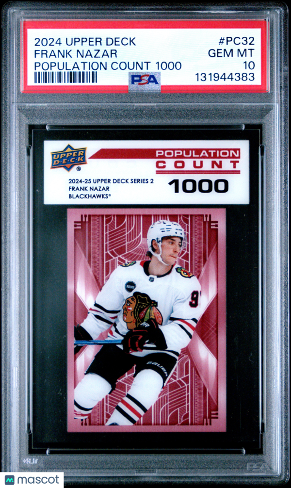You are purchasing a 2024 Upper Deck Population Count 1000 Frank Nazar #PC32 Rookie Low Pop PSA 10. You will receive the exact item in the photographs. Thank you for looking.