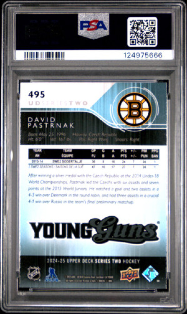 Thanks for your looking at my listing 2024 Upper Deck Young Guns Renewed David Pastrnak Exclusives /100 PSA 9. Let me know if you have any questions!