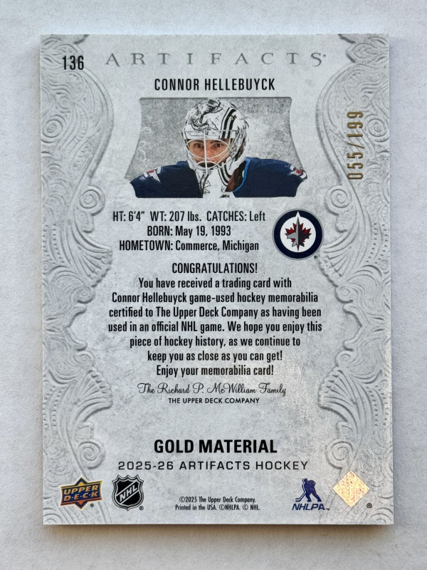 2025-26 Artifacts Gold Material - Connor Hellebuyck /199