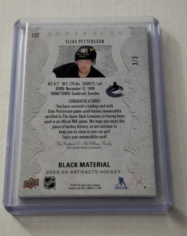 2025-26 UD Artifacts Black Material Patch Elias Pettersson #/3 Canucks