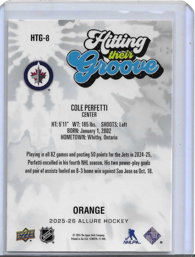 You are purchasing a 2026 2025-26 Upper Deck Cole Perfetti #HTG-8 Groove Parallel/Variety Insert Upper Deck. You will receive the exact item in the photographs. Thank you for looking.