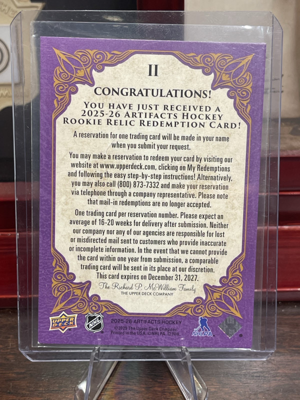 2025-26 Upper Deck Artifacts Rookie Relic Redemption II Purple Patch-Patch SSP Unscratched.