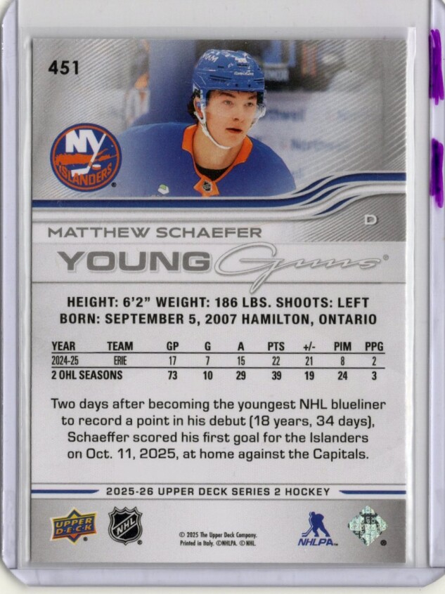 2025-26 Upper Deck Series 2 YOUNG GUNS RC Matthew Schaefer #451