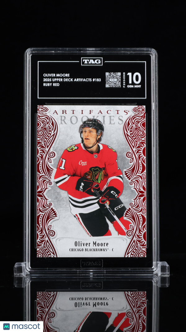 You are purchasing a 2025 Upper Deck Artifacts Oliver Moore #183 Ruby Red 104/599 Rookie TAG 10. You will receive the exact item in the photographs. Thank you for looking.