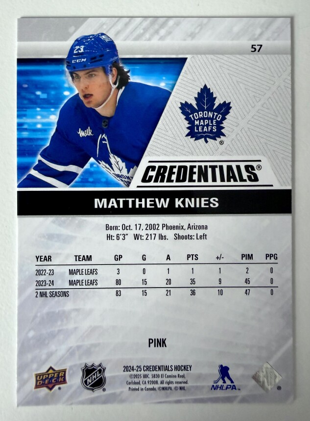 You are purchasing a 2025 Upper Deck Credentials Matthew Knies Pink 81/99. You will receive the exact item in the photographs. Thank you for looking.