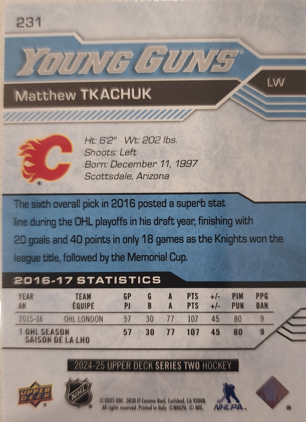 2025 Upper Deck Series 2 Matthew Tkachuk Young Guns Renewed