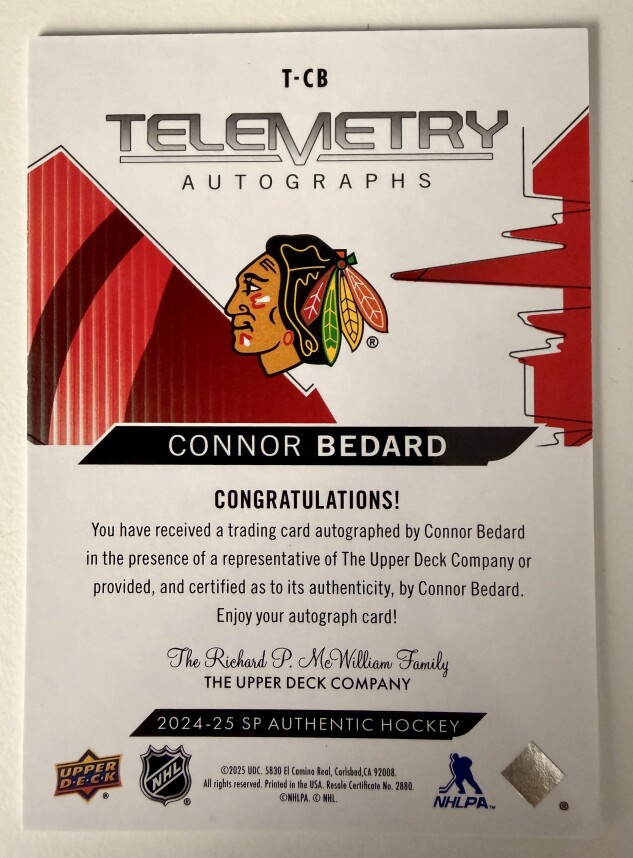You are purchasing a 2025 Upper Deck SP Authentic Telemetry Connor Bedard. You will receive the exact item in the photographs. Thank you for looking.